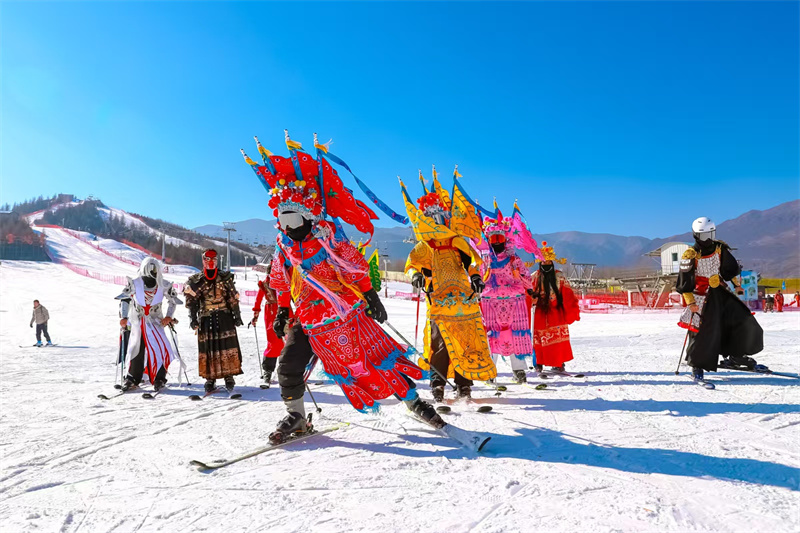 啟動儀式在歡快的《和政秧歌》中拉開帷幕,舞獅、腰鼓、國家級非遺“花兒”演唱等民俗節(jié)目輪番上演,40名滑雪教練手持國旗從雪道滑下,形成一道流動的“紅色風景線”,點燃全場熱情。